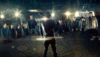 La imagen muestra (de derecha a izquierda) a Steven Yeun (Glenn), Christian Serratos (Rosita), Norman Reedus (Daryl Dixon), Danai Gurira (Michonne), Michael Cudlitz (Abraham), Lauren Cohan (Maggie), Jeffrey Dean Morgan (Negan), Andrew Lincoln (Rick Grimes), Sonequa Martin-Green (Sasha), Ross Marquand (Aaron), Chandler Riggs (Carl) y Josh McDermitt (Eugene).