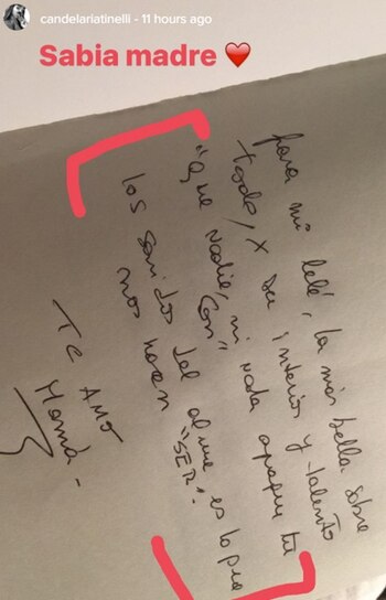 La muchacha subió una foto a su Instamoment del texto que le dedicó su mamá y agregó un "sabia madre" con letras en rojo y un corazón.