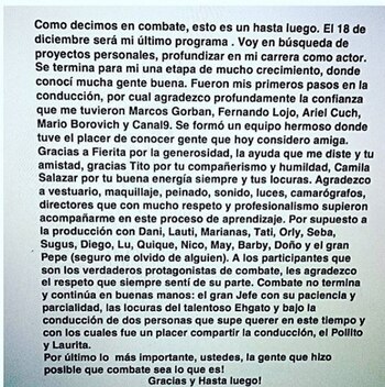 "Esto es un 'hasta luego'. El 18 de diciembre será mi último programa. Voy en búsqueda de mis proyectos personales, profundizar en mi carrera como actor", arrancó explicando en su cuenta de Instagram el joven que debutó como conductor en el ciclo, junto con "Fierita" Catalano.