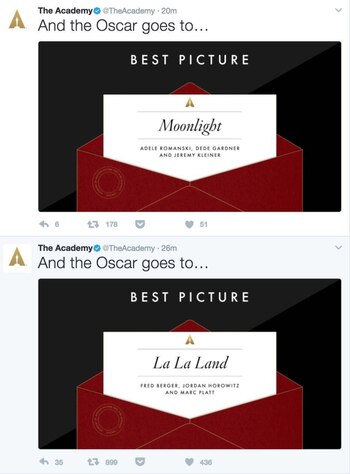 Otro equivocación muy llamativa se deslizó desde la cuenta oficial de Twitter de la Academia de Hollywood, donde también anunciaron que el musical protagonizado por Emma Stone y Ryan Gosling se había quedado con la estatuilla a Mejor Película. Luego, eliminaron ese tuit y lo reemplazaron por otro.