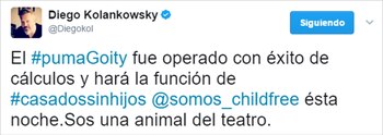 Desde la cuenta oficial de la obra también destacaron la actitud de El Puma: "Hoy lo aplaudimos fuerte porque no nos abandona ni recién operado". En la noche del viernes 31, Laurita Fernández y Fede Bal fueron a ver la función, cuando Goity -quien días atrás dejó declaraciones muy fuertes, donde acusó a los medios de ser cómplices del narcotráfico– ya estaba adolorido.