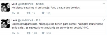Harta de las voces externas, la muchacha utilizó su Twitter para defenderse. Con una polémica frase dejó en claro que no entiende por qué sus actos generan tanto revuelo. "Chicas desaparecidas. Niños que no tienen para comer. Animales muriéndose en la calle.. es necesario una nota de un aro o de un vestido? NO", manifestó.