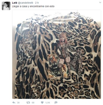 "Llegar a casa y encontrarme esto", escribió Cande en Twitter, junto con la mencionada prenda de vestir. La participante del Bailando le pidió que se la probara y que compartiera la imagen en las redes.