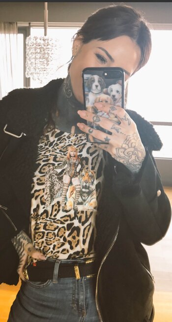 Se trata de una remera de animal print marrón y negra, con una estampa de la cantante con un tigre. La ropa pertenece a la marca que ella tiene en su país.