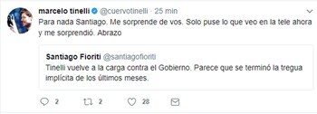 De inmediato le respondió un periodista del diario Clarín, Santiago Fioriti, quien sostuvo que el conductor volvía "a la carga contra el Gobierno" tras haber "terminado la tregua implícita".