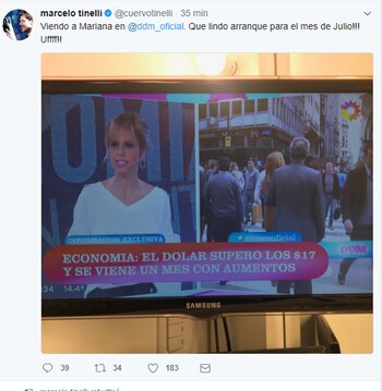 "Viendo a Mariana (Fabbiani). ¡Qué lindo arranque para el mes de julio! Uff", escribió el conductor de ShowMatch en referencia a un zócalo del programa El diario de Mariana, que informaba: "El dólar superó los $17 y se viene un mes con aumentos".