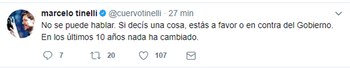 Ese y otros comentarios críticos a su tweet lo hicieron reflexionar sobre la grieta y la poca tolerancia que hay a la hora de escuchar opiniones distintas: "No se puede hablar. Si decís una cosa, estás a favor o en contra del Gobierno. En los últimos 10 años nada ha cambiado".