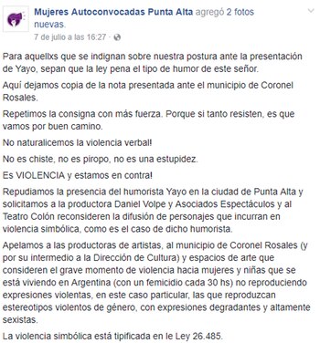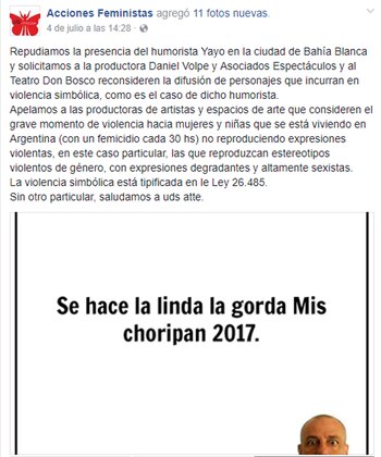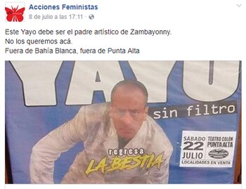 "Repudiamos la presencia del humorista Yayo en la ciudad de Bahía Blanca y solicitamos a la productora Daniel Volpe y Asociados Espectáculos y al Teatro Don Bosco reconsideren la difusión de personajes que incurran en violencia simbólica, como es el caso de dicho humorista", dijeron desde la cuenta de Facebook de "Acciones Feministas", apenas se supo que el actor haría función con Yayo, sin filtro.