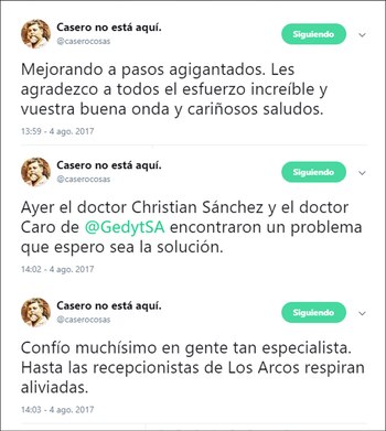 Sin embargo, tras agradecer "el esfuerzo increíble y la buena onda" que le hacen llegar, Casero evita dar mayores detalles sobre las razones que motivan su permanencia en la clínica. Y hasta es difuso al advertir que los doctores que lo asisten, y en quienes "confía muchísimo", pudieron "encontrar un problema" que -espera- "sea la solución". "Hasta las recepcionistas de Los Arcos respiran aliviadas", describe.