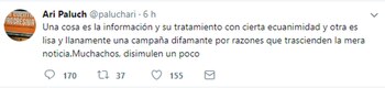 "En el canal al día siguiente me dijeron que había habido una denuncia por esta situación. Estaba sorprendido porque no creí haber generado daño, quise pedirle disculpas y dijo que no quería hablar conmigo y que no me iba a microfonear", agregó Paluch e insistió en que no fue su intención hacerle daño a nadie.