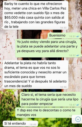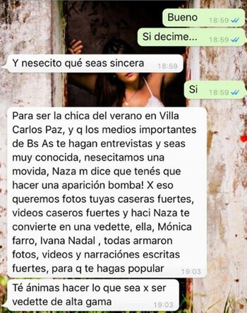 "Necesito fotos tuyas y un video casero para poder mostrarle a la empresaria teatral (Nazarena). Las fotos y el video tienen que ser fuertes, con mucha audacia. Necesito que Nazarena vea que estás re dispuesta a todo con tal de ser La chica del verano", le pedía el falso socio de la actriz a una joven.