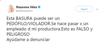 "Esta basura puede ser un pedófilo/violador. Se hace pasar por un empleado de mi productora. Esto es falso y peligroso", había escrito Vélez en Twitter, junto con las capturas de chat en el que un hombre le pide a una chica que le mande fotos para una audición para una obra de teatro.