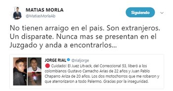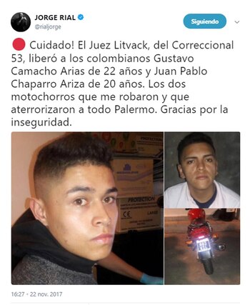 "Cuidado! El Juez Litvack, del Correccional 53, liberó a los colombianos Gustavo Camacho Arias de 22 años y Juan Pablo Chaparro Ariza de 20 años. Los dos motochorros que me robaron y que aterrorizaron a todo Palermo. Gracias por la inseguridad". Des esta manera Jorge Rial advirtió a sus seguidores de Twitter, tras enterarse de que los dos acusados de haberlo asaltado el pasado 25 de octubre en la vereda de Fitz Roy al 1500, a plena luz del día. El mensaje está acompañado por la foto de ambos y hasta la patente de la moto que utilizan.