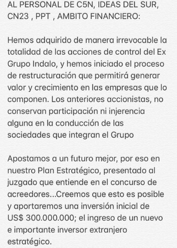 "Hemos adquirido de manera irrevocable la totalidad de las acciones de control del Ex Grupo Indalo, y hemos iniciado el proceso de restructuración que permitirá generar valor y crecimiento en las empresas que lo componen. Los anteriores accionistas, no conservan participación ni injerencia alguna en la conducción de las sociedades que integran el Grupo", detalla el texto y adelanta que "inmediatamente hemos designado en los directorios de las empresas nuevas autoridades como fuera informado a los organismos competentes y al juzgado".