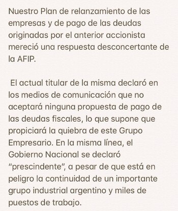 "Nuestro Plan de relanzamiento de las empresas y de pago de las deudas originadas por el anterior accionista mereció una respuesta desconcertante de la AFIP", sostiene el escrito de OP, y agrega que "el actual titular de la misma declaró en los medios de comunicación que no aceptará ninguna propuesta de pago de las deudas fiscales, lo que supone que propiciará la quiebra de este Grupo Empresario".