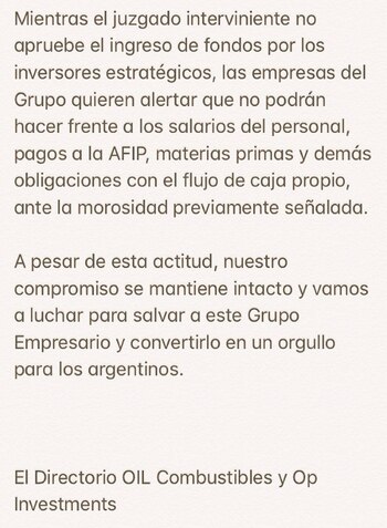 Por último, explicaron que "mientras el juzgado interviniente no apruebe el ingreso de fondos por los inversores estratégicos, las empresas del Grupo quieren alertar que no podrán hacer frente a los salarios del personal, pagos a la AFIP, materias primas y demás obligaciones con el flujo de caja propio, ante la morosidad previamente señalada". Y concluyeron que "a pesar de esta actitud, nuestro compromiso se mantiene intacto y vamos a luchar para salvar a este Grupo Empresario y convertirlo en un orgullo para los argentinos".