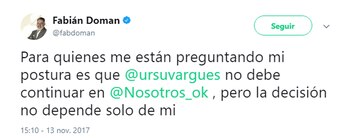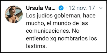 El escándalo ocurrió el pasado 12 de noviembre. A través de su cuenta en Twitter, Ursula Vargues se refirió al escándalo en la ceremonia de los Martín Fierro de Radio, en donde le gritaron insultos antisemitas a Alfredo Leuco. Pero la modelo y conductora escribió polémicos mensajes en Twitter que dieron lugar a un fuerte repudio y la echaron de Nosotros a la mañana, el programa conducido por Fabián Doman donde trabajaba como panelista.