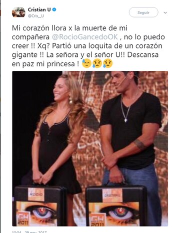 Antes de hablar en televisión, el panelista le había dedicado un mensaje en las redes sociales con una foto de ellos ingresando a la casa de Gran Hermano: "Mi corazón llora por la muerte de mi compañera, no lo puedo creer, ¿por qué? Partió una loquita de un corazón gigante. La señora y el señor U. Descansa en paz mi princesa".