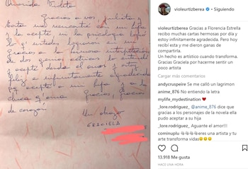 "Gracias a Florencia Estrella recibo muchas cartas hermosas por día y estoy infinitamente agradecida. Pero hoy recibí ésta y me dieron ganas de compartirla. Un hecho es artístico cuando transforma. Gracias Graciela por hacerme sentir un poco artista", le respondió la actriz, conmovida y agradecida por el gesto.