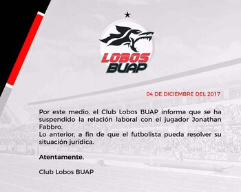 Por la gran repercusión que tuvo todo este escándalo, el club mexicano Lobos BUAP emitió un comunicado para informar que habían "suspendido la relación laboral" con Jonathan Fabbro hasta que pueda "resolver su situación jurídica".
