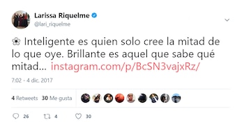 "Inteligente es quien solo cree la mitad de lo que oye. Brillante es aquel que sabe qué mitad…", escribió Larissa Riquelme en su cuenta de Twitter. Esta frase generó revuelo en la red social, ya que fue publicada el mismo día que el juez Santiago Quian Zavalía pidiera a Interpol la captura internacional de su pareja, Jonathan Fabbro.