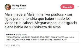"Mala madera, mala mina. Fui piadosa por sus hijos pero le tendría que haber tirado los videos por la cabeza. Alegrarse con la desgracia ajena habla de su pobreza de alma", escribió Nancy.