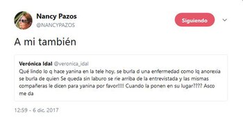 Luego se hizo eco de un mensaje de otro usuario que decía: "Qué lindo lo que hace Yanina en la tele hoy, se burla de una enfermedad como la anorexia, se burla de quien se queda sin laburo, se ríe arriba de la entrevistada y las mismas compañeras le dicen '¡para Yanina, por favor!' ¿Cuándo la ponen en su lugar? Asco me da". Nancy le respondió: "A mí también".