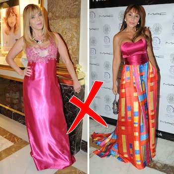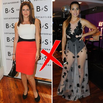 Quedó anclada en la convicción de que el rosa le queda bien, y en consecuencia, todo en Adriana lo es: el labial, el esmalte, las uñas, el collar, un fourreau que no le suma… ¡Lo estupenda que luciría con un simple vestido azul! Pero hay colores que deberían evitarse a determinada hora y lugar, y más si se acompaña de este escote innecesario: ¡el magenta! Una mujer guapa, muy sexy y con buen cuerpo como Sandra, que ligeramente decidió llevar este vestido que se podría usar, tal vez, en una boda de día.