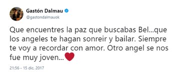 Gastón Dalmau, por su parte, utilizó su cuenta de Twitter para expresar su conmoción tras enterarse de la triste noticia. "Que encuentres la paz que buscabas, Bel. Que los ángeles te hagan sonreír y bailar. Siempre te voy a recordar con amor. Otro ángel se nos fue muy joven…", se lamentó el actor que, en la ficción, se llamaba Rama.