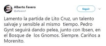 "Lamento la partida de Lito Cruz, un talento salvaje y sensible al mismo tiempo. Pedro Gynt seguirá dando pelea, junto con Ibsen, en el Bosque de los Gnomos. Siempre. Cariños a Morenito", fue el tributo de Alberto Favero.