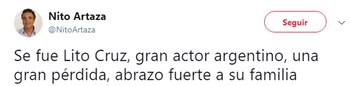"Se fue Lito Cruz, gran actor argentino, una gran pérdida, abrazo fuerte a su familia", se asoció a la despedida Nito Artaza.