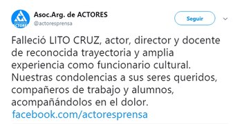 "Falleció Lito Cruz, actor, director y docente de reconocida trayectoria y amplia experiencia como funcionario cultural. Nuestras condolencias a sus seres queridos, compañeros de trabajo y alumnos, acompañándolos en el dolor", expresó la Asociación de Actores.