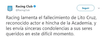 "Racing lamenta el fallecimiento de Lito Cruz, reconocido actor e hincha de la Academia, y le envía sinceras condolencias a sus seres queridos en este difícil momento", lo saludó el club de sus amores.