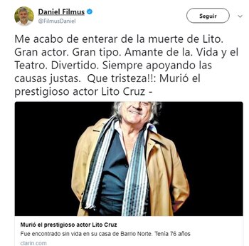 "Me acabo de enterar de la muerte de Lito. Gran actor. Gran tipo. Amante de la vida y el teatro. Divertido. Siempre apoyando las causas justas. ¡Qué tristeza", lo despidió Daniel Filmus.