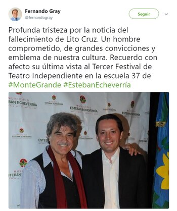 "Profunda tristeza por la noticia del fallecimiento de Lito Cruz. Un hombre comprometido, de grandes convicciones y emblema de nuestra cultura. Recuerdo con afecto su última vista al Tercer Festival de Teatro Independiente en la escuela 37 de #MonteGrande #EstebanEcheverría", lo recordó Fernando Gray, intendente del municipio de Esteban Echeverría.