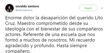 "Enorme dolor la desaparición del querido Lito Cruz. Maestro comprometido desde su ideología con el bienestar de sus compañeros actores. Referente de una escuela que nos formó a muchos de nosotros. Mi recuerdo agradecido y profundo. Hasta siempre compañero", lo honró Osvaldo Santoro.
