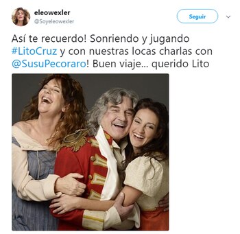 "Así te recuerdo! Sonriendo y jugando Lito Cruz y con nuestras locas charlas con @SusuPecoraro! Buen viaje…querido Lito", fueron las dulces palabras que eligió su ex compañera Eleonora Wexler.