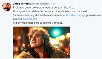 Otro político que se adhirió a la despedida fue el intendente de Avellaneda, Jorge Ferraresi. "Profundo dolor provoca la muerte del gran Lito Cruz. Una figura inolvidable del teatro, el cine y la televisión nacional. Siempre cercano y dispuesto a acompañar al @teatro_roma y generoso con nuestra #Avellaneda. Mis condolencias para su familia y amigos", escribió.