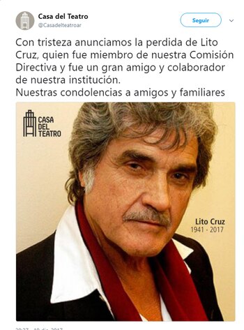 "Con tristeza anunciamos la perdida de Lito Cruz, quien fue miembro de nuestra Comisión Directiva y fue un gran amigo y colaborador de nuestra institución. Nuestras condolencias a amigos y familiares", lo despidió la Casa del Teatro.