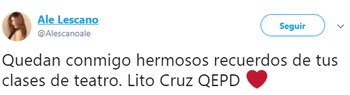 "Quedan conmigo hermosos recuerdos de tus clases de teatro Lito Cruz", fueron las palabras de la modelo y conductora Alejandra Lescano, una de las tantas personas que formó el actor a lo largo de su rica trayectoria.