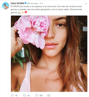 Calu Rivero escribió un mensaje para sus seguidores, en agradecimiento al apoyo y al amor recibido en los últimos días, tras el escándalo con su ex compañero en Dulce Amor, Juan Darthés, a quien acusa de "excederse" en las grabaciones de las escenas subidas de tono.
