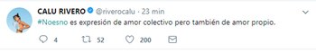 Más tarde, agregó en otro tuit: "#Noesno es expresión de amor colectivo pero también de amor propio", en alusión al hashtag que se impuso en los últimos días en las redes sociales contra el acoso.