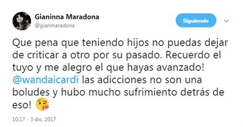 Ante estas palabras , Gianinna Maradona utilizó su cuenta en la red social para responderle: "Qué pena que teniendo hijos no puedas dejar de criticar a otro por su pasado. ¡Recuerdo el tuyo y me alegro el que hayas avanzado! ¡@wandaicardi las adicciones no son una boludez y hubo mucho sufrimiento detrás de eso!"