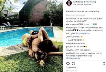 "Besos así para toda la vida", posteó él junto a una imagen donde se los ve a ambos abrazados y a los "arrumacos" al borde de la pileta de la casa que él alquila durante la temporada.