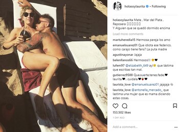 En tanto, ella compartió una imagen besándose a orillas del mar con la leyenda "mi chico malo", y otra más divertida donde se la ve a la subcampeona del Bailando acostada en una reposera acompañada por el texto "Mate , Mar del Plata , reposera y alguien que se quedó dormido encima", haciendo alusión a su pareja.