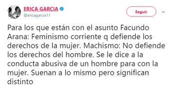 "Para los que están con el asunto Facundo Arana: Feminismo corriente que defiende los derechos de la mujer. Machismo: No defiende los derechos del hombre. Se le dice a la conducta abusiva de un hombre para con la mujer. Suenan a lo mismo pero significan distinto", escribió la cantante.