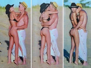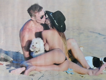 La pareja se mostró muy mimosa en la playa: lucieron sus cuerpos esculturales, se abrazaron y rieron mucho. Tal como muestran las fotos publicadas por Paparazzi, ella tomó sol en topless y él lo hizo desnudo, tapado simplemente por un pareo.