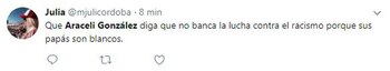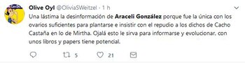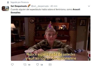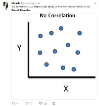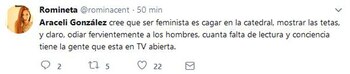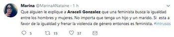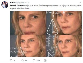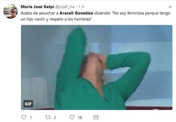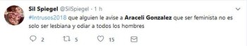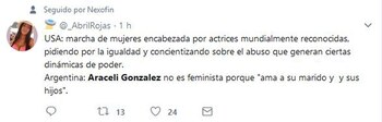 "Escuché que dijeron que soy feminista. No, yo no soy feminista, las respeto muchísimo pero tengo un hijo varón precioso y un marido hermoso y respeto mucho a los hombres también", fue la frase que dijo en el programa Intrusos, de la que luego se harían eco muchos usuarios en Twitter, convirtiendo a la actriz en trending topic (tendencia) en la red social.