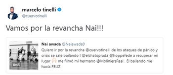 Desde Miami, en donde disfruta de unas vacaciones familiares, Marcelo no tardó en contestar que acepta la propuesta que la ex participante le hizo para volver a la pista más famosa del país. "¡Vamos por la revancha, Nai!", confirmó desde la cuenta de Twitter en la que tiene más de 10 millones de seguidores.