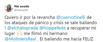 "¡Quiero ir por la revancha! ¡De los ataques de pánico y crisis se sale bailando! ¡A recuperar mi lugar! El Bailando me hacía feliz", escribió la actriz en el mensaje que también mencionó a Pablo Chato Prada y Federico Hoppe, productores ejecutivos del programa que conduce Tinelli.